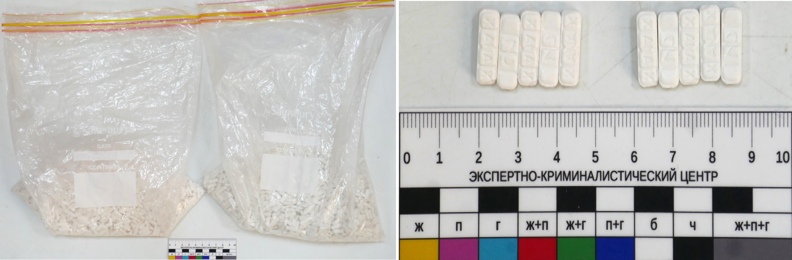 В конце февраля 2025 года в ЭКЦ УТ МВД России по ЦФО на исследование поступили продолговатые таблетки белого цвета с тремя разделительными насечками с обоих сторон и надписями «XANAX» и «2». Таблетки были изъяты таможенными органами Внуково из международного почтового отправления.