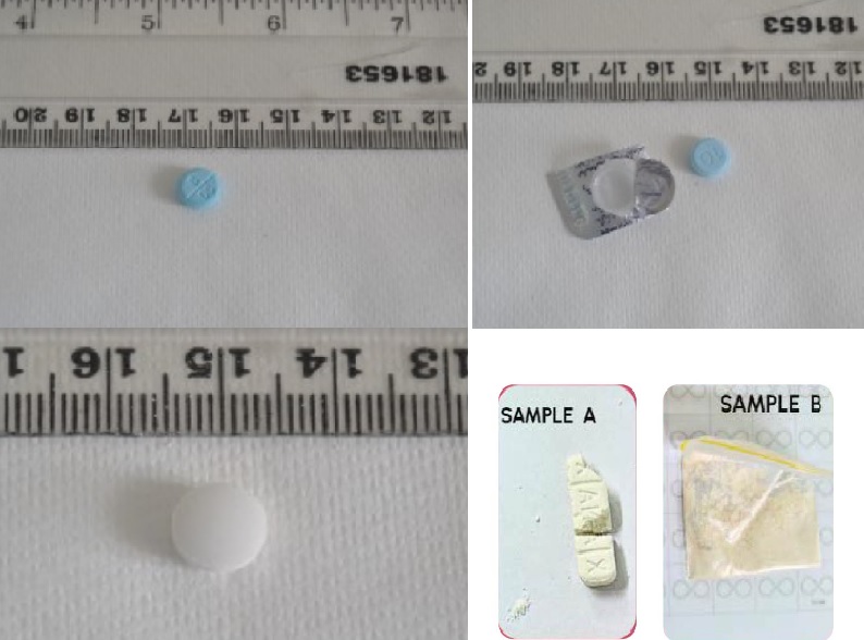 В июле в рамках проекта на исследование неоднократно поступали таблетки, заявленные как содержащие Диазепам. Как минимум в 6 случаях это были круглые таблетки голубого цвета с разделительной насечкой и надписью «DC», и в одном случае круглая таблетка белого цвета без логотипа. Анализ показал наличие в их составе Этилбромазолама, Диазепам в трех случаях в составе обнаружен не был. Также в это же время на исследование поступали измельченные таблетки Ксанакса (Альпразолам), в составе которых также был обнаружен Этилбромазолам, Альпразолама в составе не было. Напоминаем вам, что в конце февраля 2025 года в ЭКЦ УТ МВД России по ЦФО на исследование поступили продолговатые таблетки белого цвета с тремя разделительными насечками с обоих сторон и надписями «XANAX» и «2», в составе которых также был обнаружен Этилбромазолам.